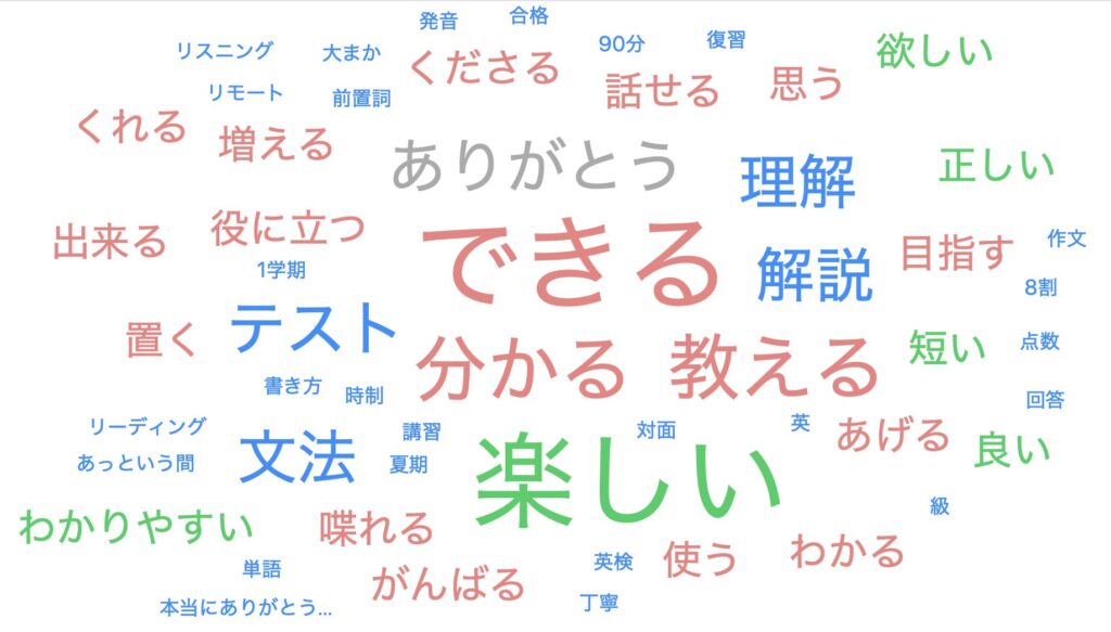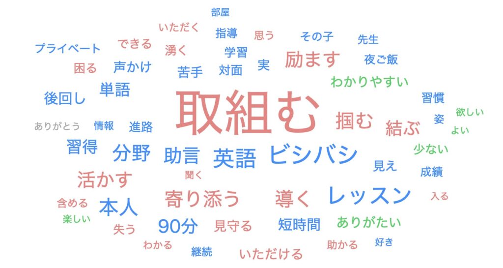 この記事の冒頭の画像は、保護者の方からいただいたアンケートの言葉をワードクラウドにまとめたものです。