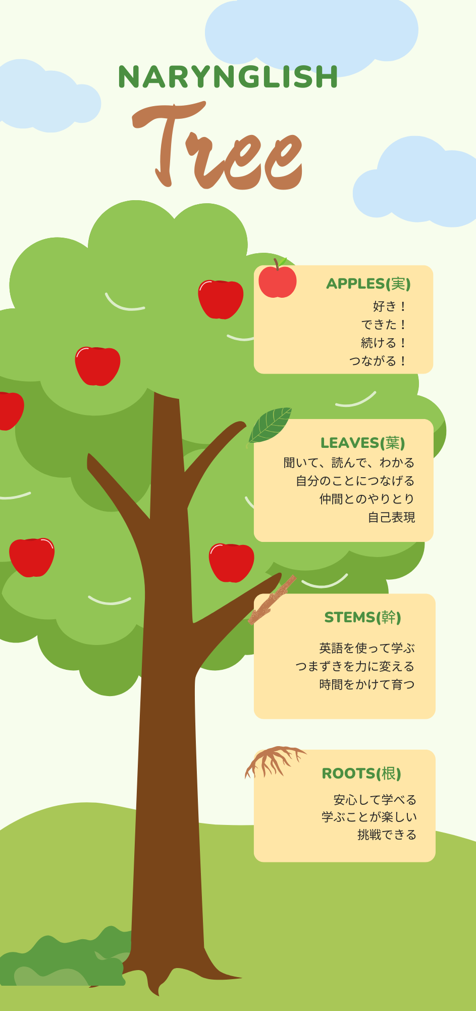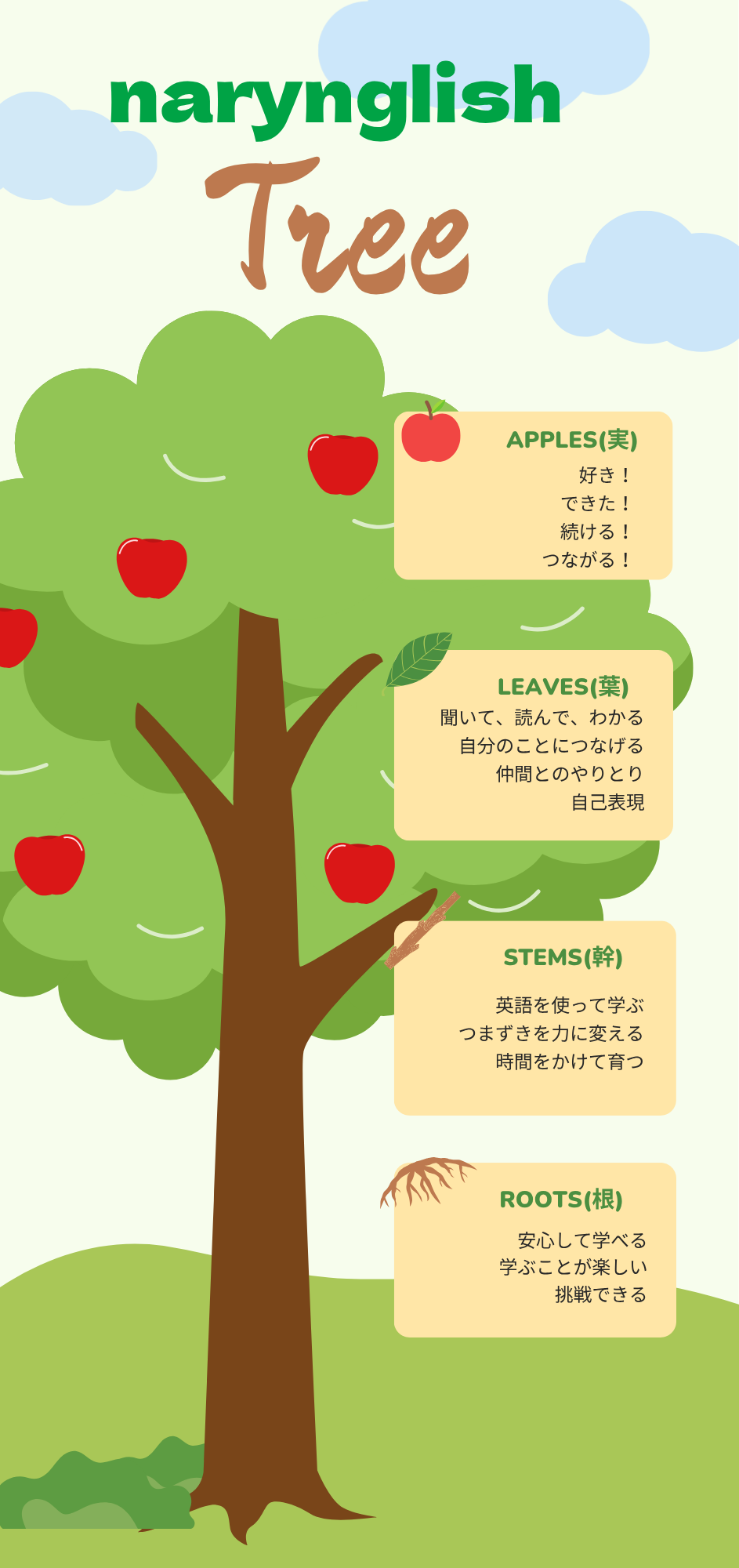 このTreeが、narynglishの英語レッスンの土台で「言語力 x 人間力」の育成を目指しています。